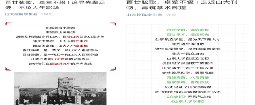 妙笔生花,共享人文精华。为创新美育形式,MG冰球突破官网网站以山大控院学生会公众号为载体,开设了“百廿弦歌,卓荦不辍”、“控山心语home”、“兴隆山下”等线上美育版块,搭建更多更好的自我学习平台,以文字形式普及人文艺术等美育知识,在理工氛围浓厚的兴隆山不忘提升人文素养,激发和满足工科学生的兴趣。紧跟时事,推出百廿专题等栏目,进一步宣扬校史、党史知识,培养同学们的爱党、爱国、爱校情怀。线上线下并举,取得显著成效。