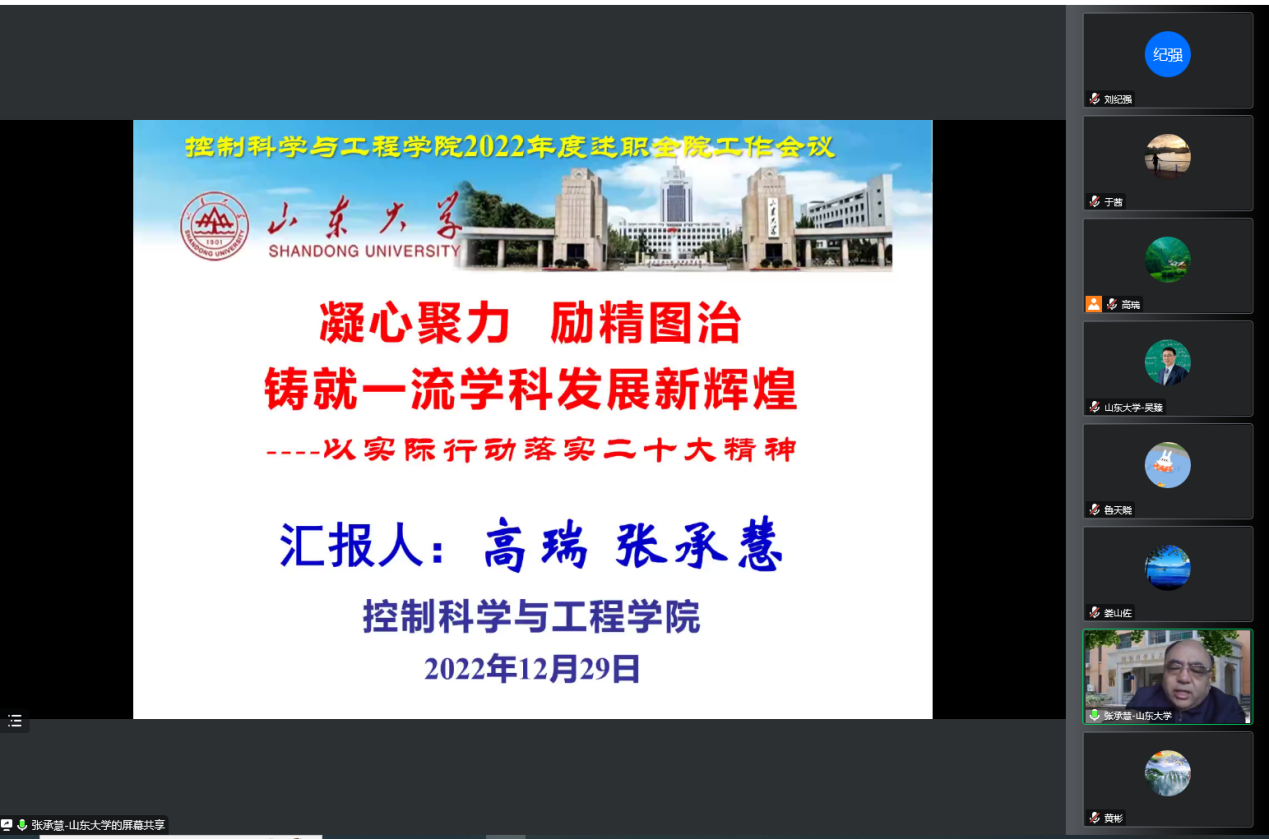 张承慧院长代表学院管服团队以“凝心聚力,励精图治,铸就一流学科发展新辉煌”为题做了MG冰球突破官网网站2022年述职报告,围绕2022年度工作进展、建设任务与完成进度、奋斗目标与未来愿景等三个部分对学院事业发展进行了系统总结,谋划了下一步工作布局。张承慧表示,学院2022-2025任务目标按阶段/超前完成,学院各项事业再上新台阶。党建引领积蓄新动能,获评“山东省五四红旗团委”、MG冰球突破官网网站“优秀基层教学组织”。杰出人才引育彰显新高度,新增国家杰青1人(高峰)、国家四青人才7人,其中国家优青2人、海外优青4人(均占全校的1/6)、青年拔尖1人,再创学院国家级人才增量历史新高;新增IEEE Fellow、ESI全球“高被引科学家”各1人、泰山学者青年专家6人。国家级人才增量/总量位居全校第一、全国同类学院学科前列。国际合作实现新跨越,获批2023年高校创新引智基地,为全校唯一。立德树人取得新成果,打造国家级一流专业全覆盖新格局,获山东省教学成果一等奖3项,获推申报国家级教学成果奖2项,山大教学终身成就奖1项。学科建设跃上新台阶,控制科学与工程学科晋级A类,综合实力名列全国同学科前茅。科学研究再创佳绩,获中国工程院光华工程科技奖和教育部技术发明一等奖各1项;山东省科学技术奖二等奖3项;中国自动化学会自然科学奖一等奖1项、二等奖3项。立项科研经费达1.5亿元/到位经费1.06亿元,暂居各学院之首。他强调,下一步学院将持续深入学习宣传贯彻党的二十大精神,加强组织建设,践行立德树人,强化学科建设,优化科研布局,深化国际合作,持之以恒用好“3D”工作法,为学校“双一流”建设贡献更大的控院力量和控院经验。